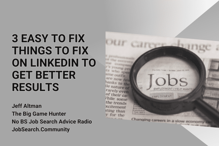 Here are three very easy things that you can do to improve your LinkedIn profile and get better results from it. I’m Jeff Alen the big game hunter. People hire me for no BS job search coaching and career advice globally because I make the process of finding work and succeeding at it much easier.
