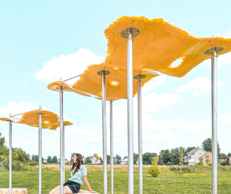 I/Thee created the Puddle Pavilion casts a floating canopy from algae resin by allowing the material to take its own shape on the ground. Built above Mud Creek in Bondurant, Iowa, the installation by design collective I/Thee, led by Neal Lucas Hitch, uses algae-based bio resin to create a translucent canopy shaped by gravity, wind, and surface tension. Once cured, the resin sheet was lifted onto slim steel columns, forming a hovering surface that resembles a frozen splash or a river suspended in the air.
