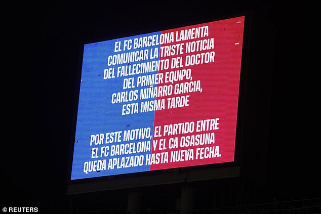 ‘LALIGA regrets the death of the doctor of the first team of FC Barcelona, Dr. Carles Miñarro, and informs that for this reason the match scheduled for today has been postponed, pending the decision of the sole judge of competitions,’ the statement read.