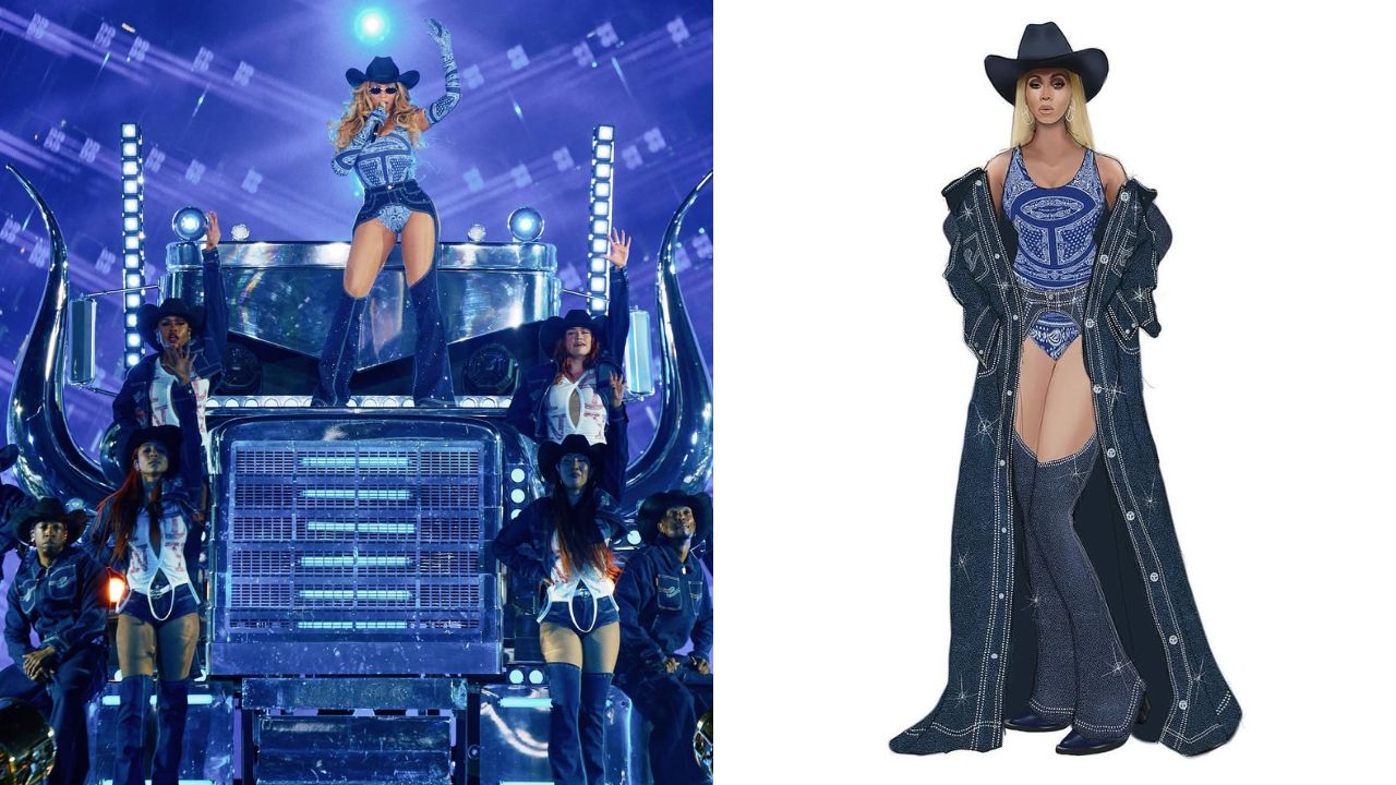 Beyonce’s “Cowboy Carter” Telfar ensemble featured a cobalt blue paisley swimsuit that had the Telfar logo centered. Her blue denim rhinestone studded chaps matched exquisitely with her denim trench jacket that was adorned with Telfar buttons and embroidery.