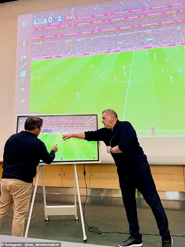 He was also pictured standing in front of a slide titled ‘From identity to methodology: Ange Postecoglou,’ presumably the name of his lecture.
