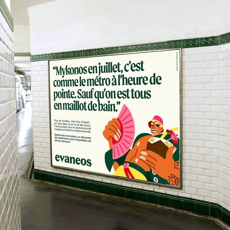 Evaneos’s campaign was developed in collaboration with creative agency Socialclub and illustrator Sibel Balac. It employs witty visual comparisons between overcrowded vacation spots and hectic urban commutes — such as equating Mykonos with Paris’ congested RER B train line — to highlight how mass tourism can degrade the very experiences travelers seek.