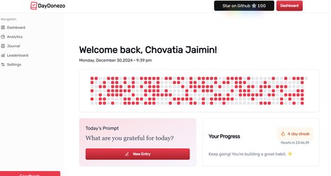 DayDonezo is a digital journaling platform designed to help users track achievements, maintain motivation, and analyze personal progress over time. The platform allows individuals to record daily wins and milestones, providing visual analytics and streak tracking to highlight patterns in behavior and performance. Data is encrypted, ensuring privacy and security for sensitive personal entries.
