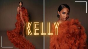 Kelly Rowland Posed in an Orange Chocolate Valdrin Sahiti Gown with Flor De Maria Sandals