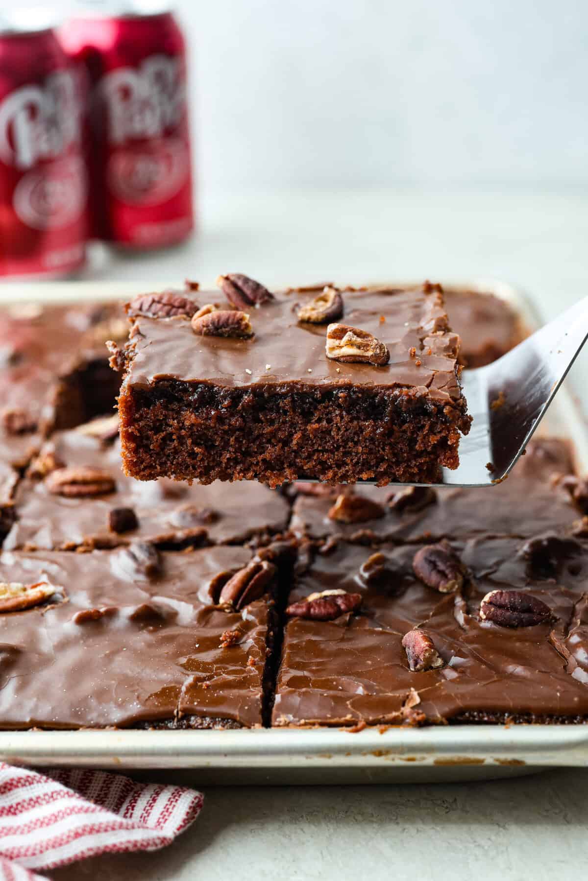 Texas sheet cake is traditionally baked in a half sheet pan, yielding thinner slices. If you want thicker slices, you can bake Dr. Pepper Sheet cake in a 9 x 13-inch pan. You will need to increase your baking time to 30 minutes or until a toothpick comes out clean.