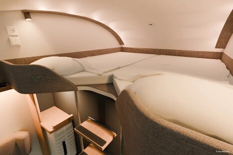 Nox’s service will offer three distinct room types — Single, Double Loft, and Double Vista — each designed to maximize space and convenience. European travelers can expect two-meter-long beds, convertible seating areas, large work tables, and expansive windows. The pricing strategy is competitive with airfare. Single rooms start at €79, while double rooms go for €149.