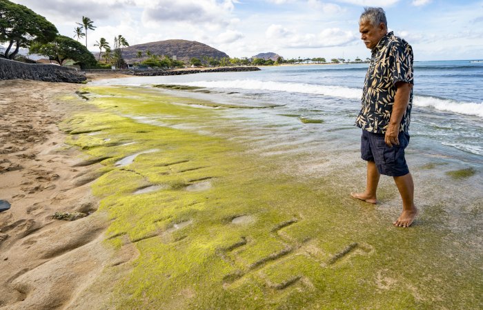 Cultural practitioner Glen Kila walks around the petroglyphs carved into the rock at Pokai Bay during low tide, July 22, 2025, in Waianae, Hawaii. Credit: AP Photo/Mengshin Lin