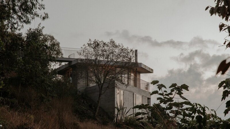 The Concrete House blends sculptural form with panoramic views in Guatapé, Colombia. It is designed by Atelier García, and the two-story residence perches atop a hill using a triangular concrete plinth and roof that overlook the dramatic Rock of Guatapé and reservoir. The compact 120 m² layout unfolds in three spatial stages: a private lower level partially embedded in the terrain, a glazed upper social floor with sweeping views, and an open-air circular rooftop terrace offering 360° vistas.