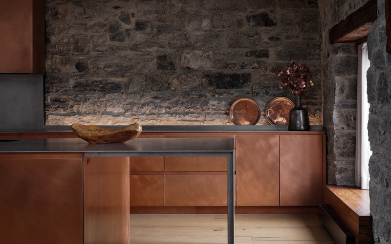 MU Architecture designed an open-concept layout on the main floor to facilitate fluid movement between living areas, a custom-designed kitchen with distinctive copper cabinetry and stainless steel surfaces serving as a bold centerpiece, and a sculptural staircase connecting to a privately reimagined upper level housing boutique hotel-inspired bedrooms and bathrooms. The firm was strategic about its selection of materials, as well. The exceptionally wide and long oak plank flooring, for example, immediately captures attention.