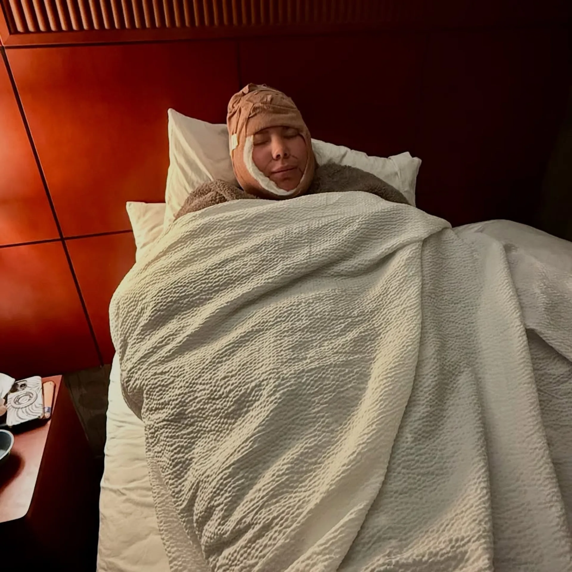 “This is day one post op,” she said at one point, smirking with her face wrapped … while eating instant mashed potatoes.