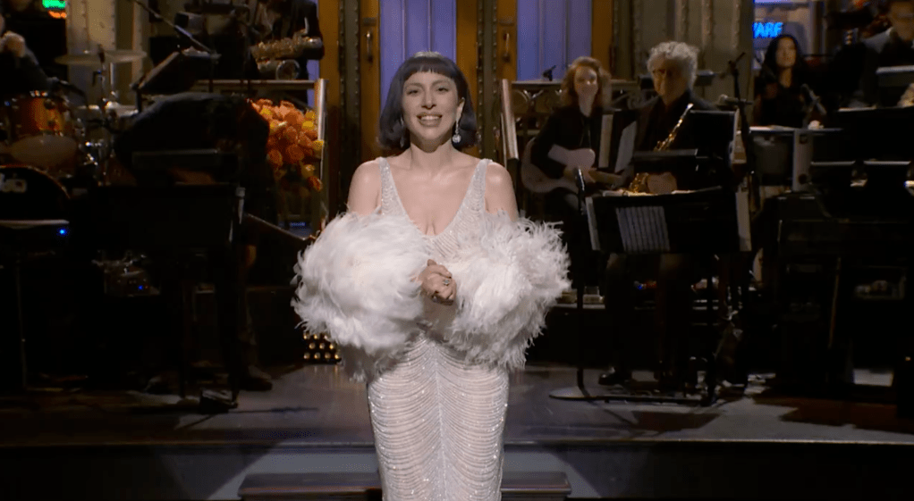 As Lady Gaga strutted out and shimmied in a shimmering flapper-like ensemble, complete with a magnificent lob and feather coat, the chart-topping artist — tonight pulling double-duty as musical guest and host of Saturday Night Live — had no trouble turning the joke on herself.