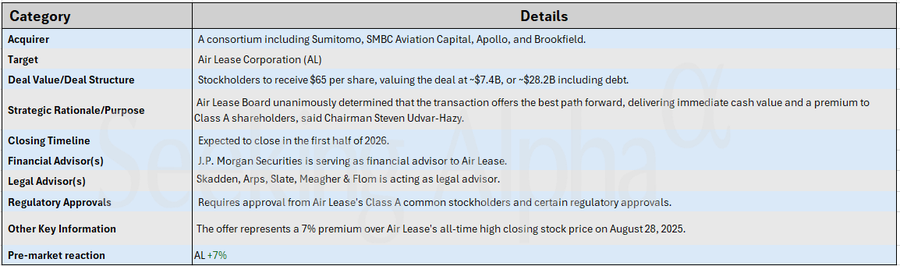 HomeMarketM&A Snapshot: Air Lease stock up on $7.4B buyout by Dublin-based consortium Posted in MarketM&A Snapshot: Air Lease stock up on $7.4B buyout by Dublin-based consortium September 2, 2025 Reporter M&A Snapshot: Air Lease stock up on $7.4B buyout by Dublin-based consortium Source link