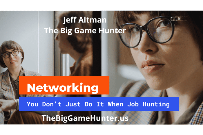 Networking is not something that you do only when you’re job hunting. It’s for the times between your job searches where you build the relationships and make the connections and build the relationships that are going to get you results when you need them and when they need you. Understand if you’re just a mooch, if you’re just a selfish individual who’s going give me give me give me, who’s going to want to help you? After all, how many people have you wanted to help who’ve acted that way with you? Put yourself into situations where you’re going to meet new people.