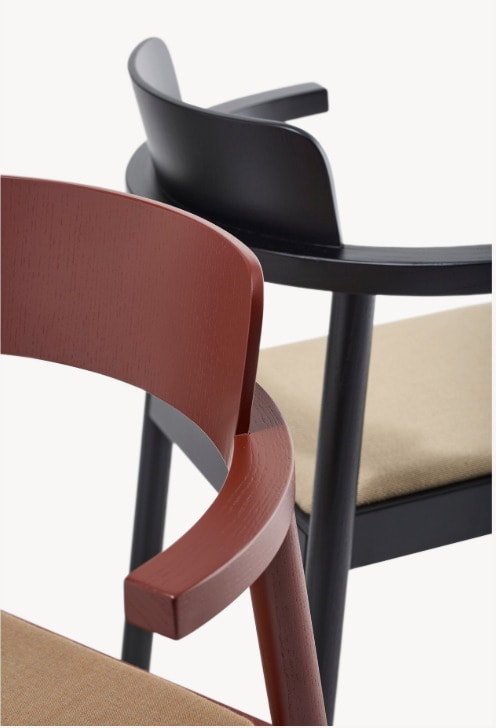 The Aroma Chair boasts a solid ash wood construction, precise steam-bent craftsmanship, and an ergonomic reinterpretation of classic features, particularly the widened semicircular armrest. Through these features, the piece achieves comfort while maintaining a modern visual lightness.
