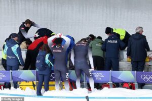 Bobsleigh driver hospitalised at Winter Olympics after terrifying crash during four-man final – with event delayed by over 20 minutes while he received urgent medical attention