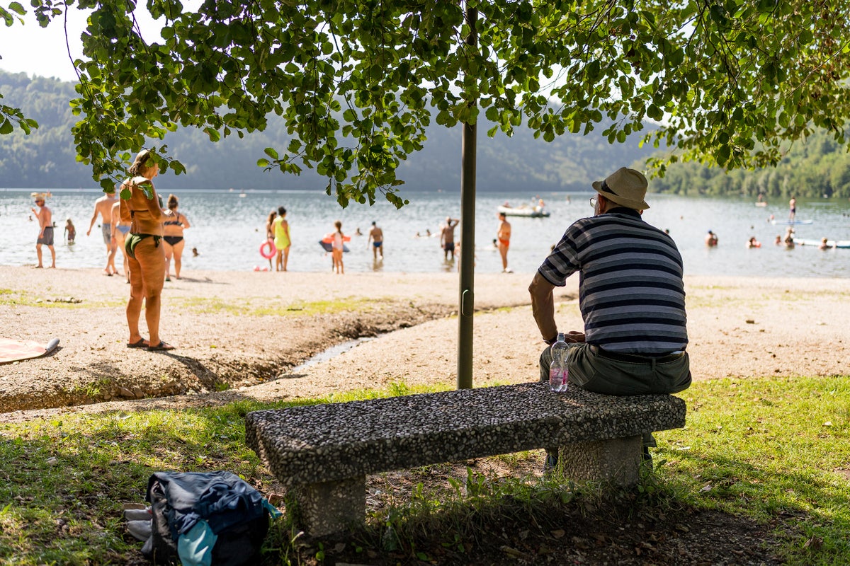 An elderly man is seen resting under a tree at Levico lake. With temperatures exceeding 45 degrees Celsius in many parts of Italy, and wildfires burning in France, Spain and Portugal, Europe is under under alert as the heatwave grips the continent.