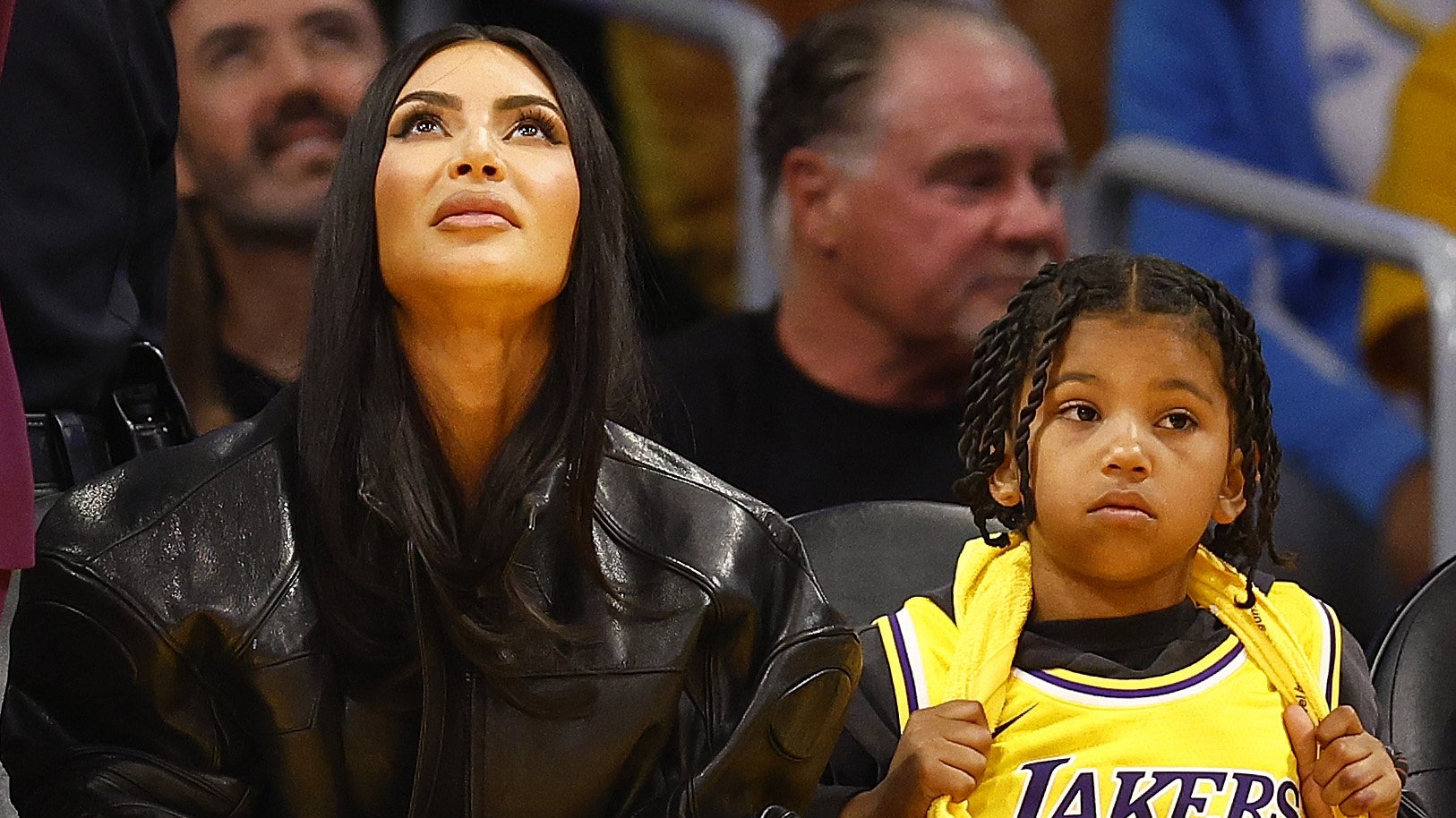 Kim Kardashian and Saint West during play between the Memphis Grizzlies and the Los Angeles Lakers in the first half of Game Four of the Western Conference First Round Playoffs at Crypto.com Arena on April 24, 2023. (Photo Credit: Ronald Martinez/Getty Images)