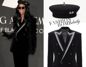 Brandy in a Black Velvet Crystal-Embellished Balmain Blazer and Beret at the Recording Academy Honors