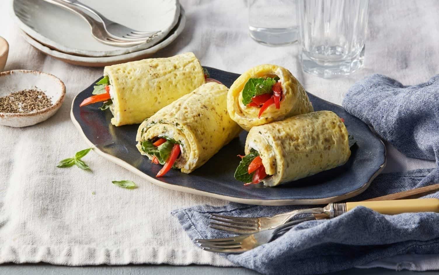 Pro tip: Make sure to roll up the sheet pan omelet roll ups while the eggs are still hot and pliable, cooled egg wraps tend to crack.