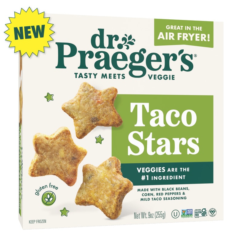 Alongside Pizza Stars, Dr. Praeger’s launched Taco Stars made with black beans, corn, red peppers and mild taco seasoning. Like the Pizza Stars, Taco Stars are gluten-free, list cauliflower as the first ingredient and are easy to prepare in the air fryer.