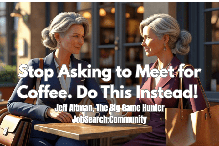 Everyone’s busy these days, and if you ask people for the same thing like “can I pick your brain” – like there’s a scab there – or “can I meet for coffee,” you’ll get the same results as everyone else. So I want to give you an idea of what you might try instead. I’m Jeff Altman, The Big Game Hunter. People hire me for no BS job search coaching and career advice globally because I make the process of finding work and succeeding at it much easier.