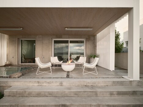 The Versant Clair Residence, designed by Muuk Architecture, presents a thoughtful approach to lakeside living through its harmonious integration with the natural landscape of Lac-Brome, Quebec. The home’s understated street-facing elevation is characterized by a white-pitched roof and pale wood cladding. These sensibilities create a restrained presence that minimizes visual disruption to the surroundings. In contrast, the rear façade opens dramatically to the lake through a double-height glazed wall. This serves to dissolve boundaries between interior and exterior while framing unobstructed views. A cantilevered balcony with slatted wooden screens enhances privacy and passive solar control. The split-level layout follows the site’s natural slope, with communal spaces on the upper level oriented toward the water and bedrooms below offering direct access to the shoreline. Sustainable considerations, such as optimized glazing for passive heating, permeable paving, and a lightweight wood structure, reflect a commitment to low-impact construction without compromising aesthetic clarity.