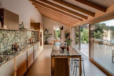 British architecture firm Forgewoods has finished the renovation of a House of Wood Shingle, which is a bungalow in Bath. The design cloaks the entire exterior with a layer of cedar shingles. It rests on top of a wooden hill in a forested area and was designed for Celia McCarthy, who is the founder of the interior design firm Richardson Studio.