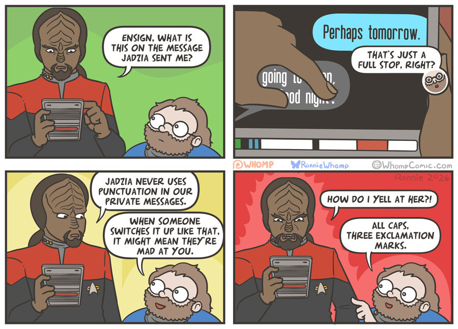 The sound of hard keratin clacking against a harder PADD emanates throughout Quark’s bar, nearly drowning out the usual rabble of the room. As Julian glances questioningly in his direction, O’Brien answers without being asked, ”Jadzia cleaned the blood off his bat’leth.”